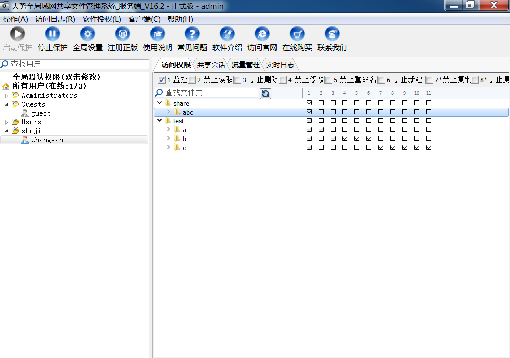 主界面主要分左右两个大的区域:左边列出当前服务器的用户,右边区域通过不同页签显示:共享目录,会话,访问日志等信息;