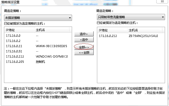 这样你就启用了聚生网管的精确控制带宽功能,从而可以精确、完全掌控局域网电脑带宽占用和网速大小。同时,你也可以把编辑后的策略,通过批量指派策略,一次性指派给局域网多台或全部电脑,从而可以实现控制整个局域网网速的功能。在主机列表这里,右键点击,然后选择“批量指派策略”(你也可以在“策略配置”这里选择),然后在弹出窗口的左侧下拉框内选择“未指派策略”,就会出现局域网内所有没有指派策略的电脑(当然,你也要选择其他策略),然后右侧选择“只限制带宽流量策略”,然后点击中间的“全部”,则左侧所有未指派策略的电脑就会被一次性被指派为“只限制带宽流量策略”,如下图所示: