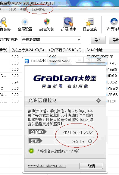 同时,如果你还有其他问题,可以直接点击聚生网管顶部“帮助”后面的“远程协助”,然后将软件协助软件形成的ID和密码告诉我们,大势至公司技术人员即可实时为您提供“现场服务”,从而免除了您部署网管软件的后顾之忧,保证网络管理效果的较大化。如下图所示:
