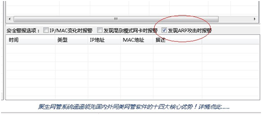3、 通过部署专业的ARP攻击防护软件、ARP病毒检测软件来检测局域网ARP攻击行为,一旦发现ARP攻击行为,则可以通过ARP攻击防御软件来对其进行防御,甚至隔离开局域网,从而一方面可以让网管员及时发现并制止局域网电脑的ARP攻击行为,甚至配合行政处罚等来管控局域网员工随意使用ARP攻击软件、ARP限速软件来干扰和破坏局域网的行为,不至于在局域网出现ARP攻击行为时无法定位查找攻击源主机的窘况;另一方面,通过ARP攻击防御软件的隔离、免疫举措,可以即时防止ARP攻击行为给局域网造成的危害,防止员工电脑不小心遭遇ARP病毒侵袭时,对局域网造成的断网攻击危害。目前,国内一些伤上网行为管理厂家推出了一系列的ARP攻击防护软件或带有ARP攻击防护功能的网络管理产品。我们以国内较为知名的网管软件“聚生网管”为例,聚生网管系统集成了ARP攻击检测功能,也就是在局域网启动聚生网管系统后,一旦有局域网电脑主动或被动发动ARP攻击行为时,聚生网管系统会实时输出发动ARP攻击的电脑的IP和MAC地址等信息,同时自动向局域网发送ARP攻击免疫信息,从而极大地降低了ARP攻击对局域网造成的危害,使得局域网电脑不会因为ARP攻击而出现掉线和断网现象。同时,通过聚生网管系统集成的“大势至局域网安全卫士”,可以将发动ARP攻击的电脑进行强制隔离,使得发动ARP攻击的电脑无法再向局域网发动ARP攻击,同时也无法和局域网其他电脑通讯,也无法访问互联网,使其完全隔离开局域网。如下图所示: