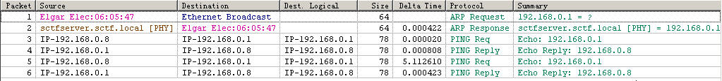 下图是捕获的数据包,它描述了Fake(192.168.0.8) Ping 192.168.0.1的全部过程: