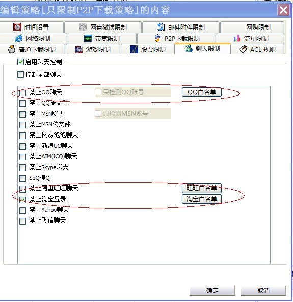 然后打开策略界面点击聊天限制,找到qq白名单、旺旺白名单、淘宝白名单添加相应账号就可以了。