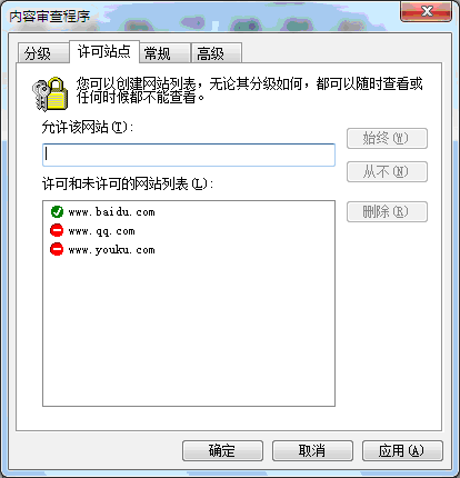 2. 在弹出的对话框中选择”许可站点”,然后添加允许访问的网站,确定之后设置监护人密码,这样其他所有网站都不允许访问了(可以输入监护人密码访问)。