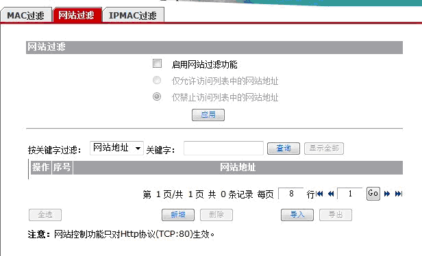 一些路由器可以实现网站过滤的功能,以H3C为例,登陆路由器之后,选择安全专区→接入控制,可以找到网站过滤选项卡,启用网站过滤功能,添加网站地址,可以根据实际情况选择允许或禁止访问列表网址。