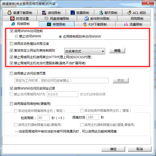 目前几乎所有网络管理软件都集成网址过滤功能,比如企业中较常见的聚生网管(下载地址:http://grablan.com/soft.html)只需要在一台电脑安装即可控制局域网其他电脑的上网行为,为企业在时间和人力上节省了不少不必要的支出。通过启用WWW访问控制,以添加网址到白名单或者黑名单的方式,就可以使员工只能登陆特定的网站,精确有效的实现了上网控制。