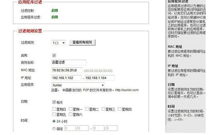 然后点击“应用程序过滤”,在打开的应用程序过滤设置页面中设置过滤规则,填写过滤规则。规则名称随便填写自己容易理解的词,填写要过滤的MAC地址或者IP地址段,在“应用程序”项选择“迅雷”,设置过滤的日期及时间段,确认无误后点击“应用”,设置完成。
