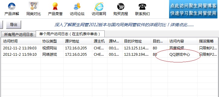 启用QQ游戏控制之后,如果局域网有人玩QQ游戏,则聚生网管系统会实时输出拦截QQ游戏的日志,这样网管员就可以实时控制局域网电脑玩QQ游戏的行为了。如下图所示: