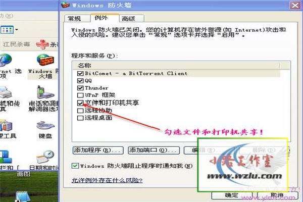 1.开始-设置-控制面板-防火墙-例外-勾选“文件和打印机共享”!当然你也可以关闭防火墙。