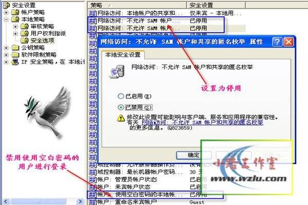 将“网络访问:不允许SAM账户的匿名枚举”停用 注意此点只对来宾起效,将在第六章说到。