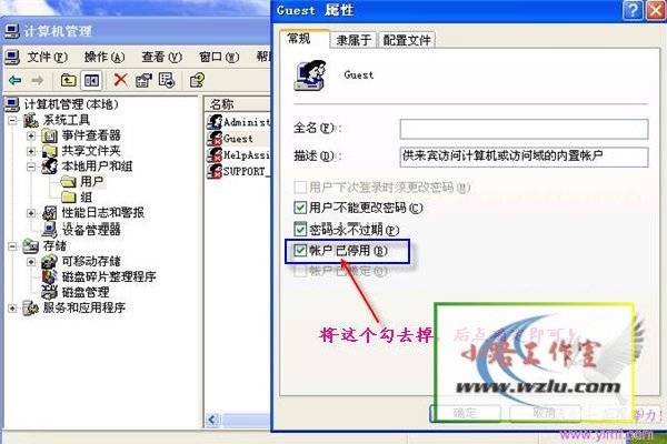 1.“我的电脑”右键-管理-本地用户和组-用户-启用来宾(注意:在这里启用来宾的效果和在控制面板-用户账户里面启用来宾是一样的。区别就是在此启用后面板里面的来宾还是显示没有启用的,而在面板里面启用来宾的话这里也就启用了。)