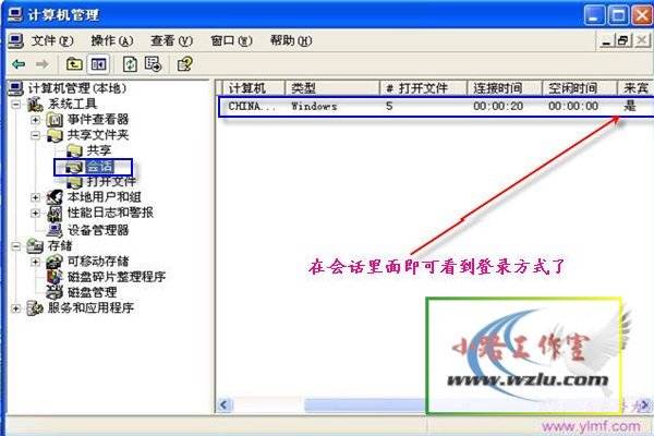 4.在计算机管理里面-共享文件夹-会话里面就可以看到登录方式了