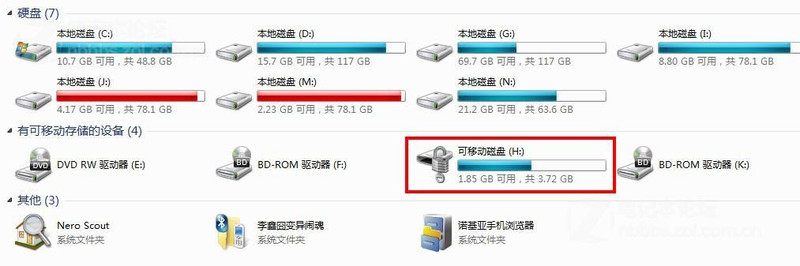 点选进去后,磁盘与操作区很明显的显示出来,GCD盘(请勿连读)为电脑硬盘,H盘是我之前已经实验成功加过密的4G联想U盘,I、J、M、N盘为一块320G移动硬盘。我们假设H盘没有进行加密,点击右侧启动BitLocker加密程序。