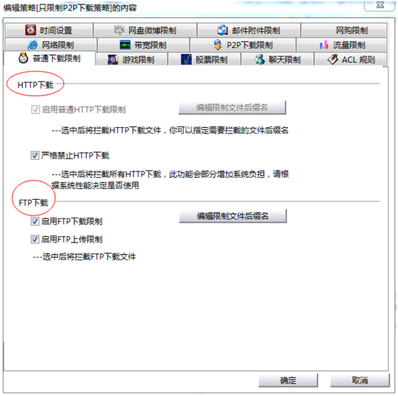 当然,在实际的网络管理中,我们可能不会完全禁止局域网下载行为,毕竟工作中有时候的确需要从网上下载一些东西,那么这种情况下你也可以通过控制局域网下载速度、限制下载速度的方式来达到一种合适的下载速度,这样既满足了工作需要,也防止了P2P下载或普通HTTP下载速度过高而出现局域网抢网速、抢流量的行为等,实现了适度的网络管理。如下图所示: