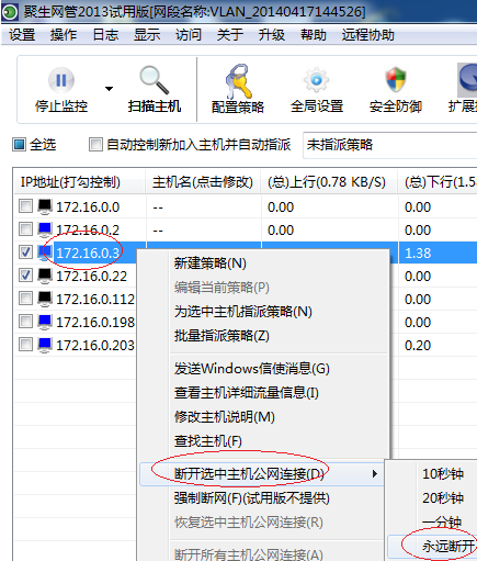 当前,有很多无线局域网网络控制软件都可以查找局域网手机、平板电脑等,然后通过网络控制软件来阻止手机、平板电脑无线上网。例如,当前有一款“聚生网管”(下载地址:http://www.grablan.com/soft.html)的网络控制软件,可以检测局域网手机、平板电脑,然后发现局域网手机、平板电脑之后,你可以启用聚生网管的断网功能将其阻断上网,从而限制员工手机无线上网、禁止手机接wifi的目的。如下图所示: