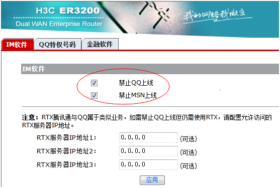 现在的路由器大都都带有一定的网络管理功能,可以实现禁止局域网下载、禁止P2P软件使用的功能。我们以较常用的H3C路由器和TPlink路由器为例,一般在路由器的“应用控制”里面,具体有所不同,如下图所示: