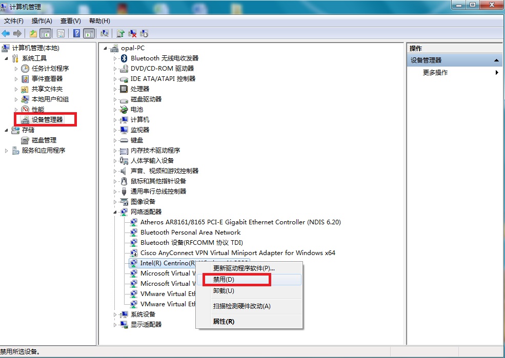 操作方法比较简单。右键点击“我的电脑”,然后选择“管理”,在弹出窗口计算机管理中选择“设备管理器”,查看右侧“网络适配器”,根据BOM中无线网卡型号选择对应的无线网卡(如:BCM、intel或802.11等字样),右键选择该设备单击禁用即可。如下图所示