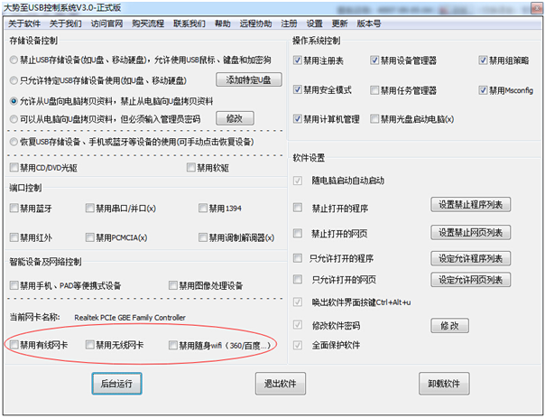图:大势至禁用U盘软件禁止无线网卡、禁用有线网卡、禁止随身wifi的使用