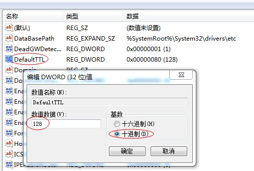 4.选择HKEY_LOCAL_MACHINE\SYSTEM\CurrentControlSet\Services\Tcpip\Parameters,然后再右侧你就可以看到DefaultTTL,然后你双击或右键点击即可修改。注意:在“基数”哪里选择“十进制”,然后在左边的框内输入“128“,然后点击确定,重启电脑即可。