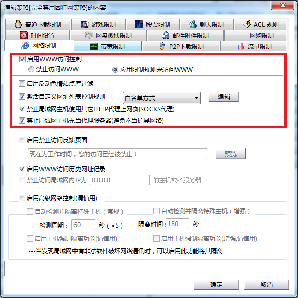 目前几乎所有网络管理软件都集成网址过滤功能,比如较常见的“聚生网管”系统(下载地址:http://www.grablan.com/soft.html)只需要在一台电脑安装即可控制局域网其他电脑的上网行为,为企业在时间和人力上节省了不少不必要的支出。通过启用WWW访问控制,以添加网址到白名单或者黑名单的方式,就可以使员工只能登陆特定的网站,精确有效的实现了上网控制,如下图所示: