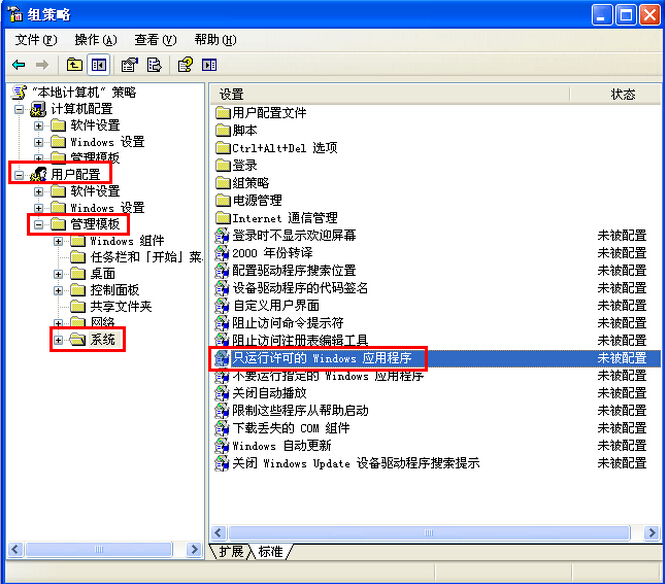 通过组策略可以达到同样的控制效果,首先运行“gpedit.msc”打开组策略,然后选择,用户配置管理模板系统,找到“只运行许可的Windows 应用程序”打开