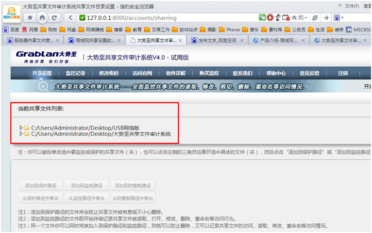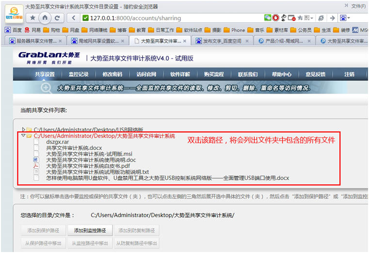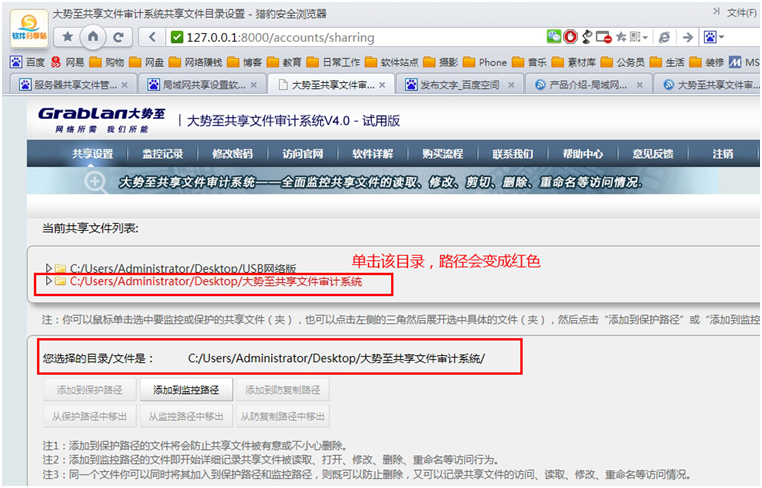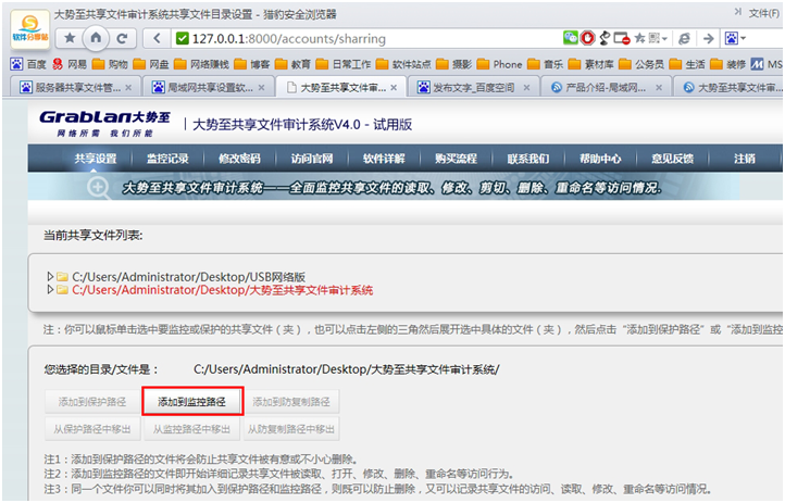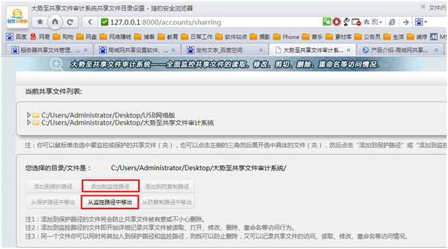 下面也会提示您选择的目录/文件是:C:\Users\Administrator\Desktop\大势至共享文件审计系统