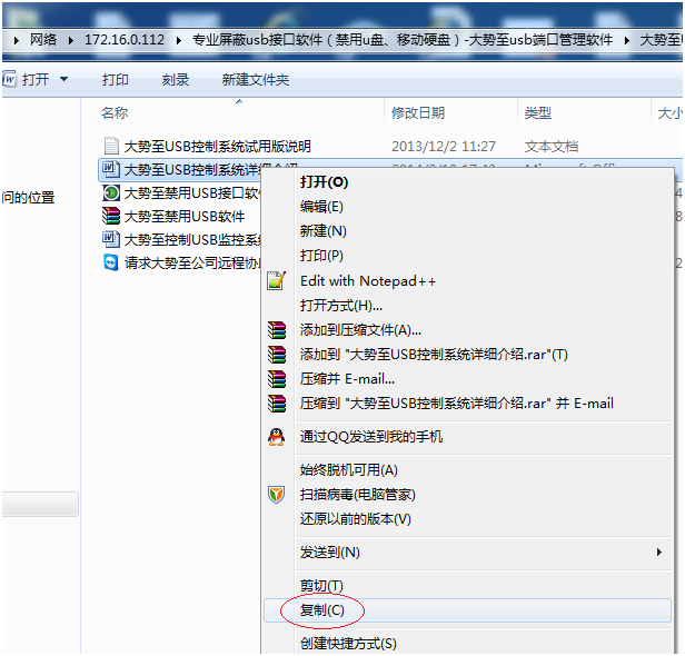 其次,还要考虑一下这样安全性高吗?相信大家都知道一台电脑里有N个文件,每个文件的重要性也不一样,有的可以让人看,让人修改,让人复制/粘贴,但是如果那些很重要的文件呢,如果有人恶意修改、复制呢?那么接下来就用到”添加到防复制路径“的功能了,这个是大势至共享文件审计系统V4.0版本,新增的功能。