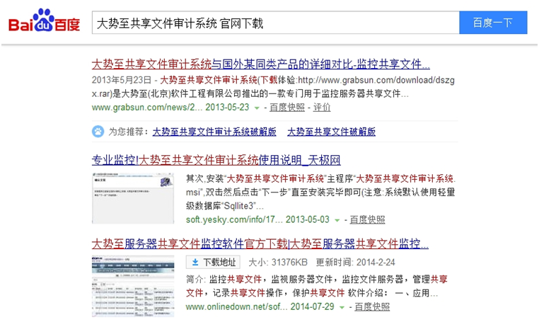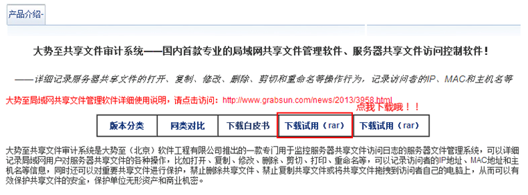 1.首先,找到下载地址,可在百度搜索“大势至共享文件审计系统 官网下载(下载地址:http://www.grablan.com/gongxiangwenjianshenji.html)”如下: