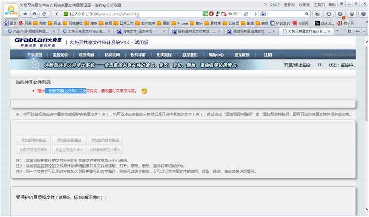 1)首先,在没有设置任何共享文件的时候,在审计系统中“当前共享文件列表”会提示:您服务器上没有任何共享文件夹,请设置可共享文件夹。