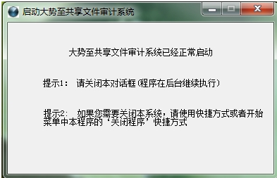 1.双击桌面上的”启动大势至共享文件审计系统“图标”弹出下面的对话框,然后根据提示关闭对话框。