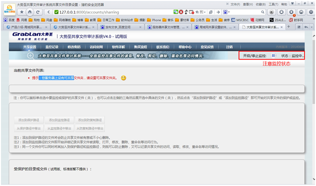 4.打开大势至文件审计系统的后台之后首先要看一下监控的状态是正常的也就是“监控中...”