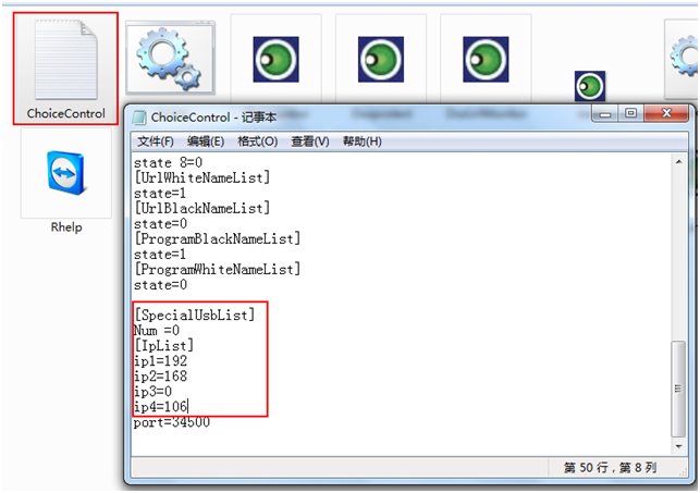 由于“客户端”需要和“管理端”通讯,所以较早次我们还需要在客户端的安装目录下面配置连接“管理端”的IP地址,比如管理端的电脑IP地址为192.168.0.106,则我们需要打开客户端的安装目录(一般为C:\Windows\Dszusbmonitor)下面的“ChoiceControl”文件,然后拉到底部,这里可以修改连接“管理端”的IP地址(默认为127.0.0.1),也即分别修改IP1=192,IP2=168,IP3=0,IP4=106,修改完成之后保存关闭即可。如下图: