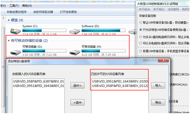 以上就是允许特定U盘的功能,怎么样?很强大吧,另外需要注意的是如果插入优盘在当前插入的USB设备列表中如果没有出现你插入的USB设备那么退出软件重新打开软件就可以了。