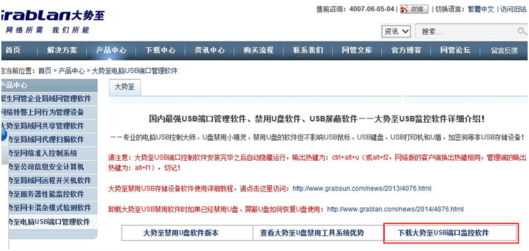大势至USB端口管理软件下载地址:http://www.grablan.com/monitorusb.html 大势至公司官网:http://www.grablan.com/