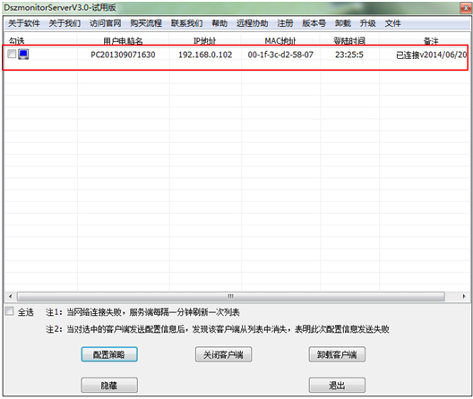 关闭配置窗口后,就会提示是否确定将配置策略发送到客户端,点击确定。这时候看看客户端那边的情况,如下图: