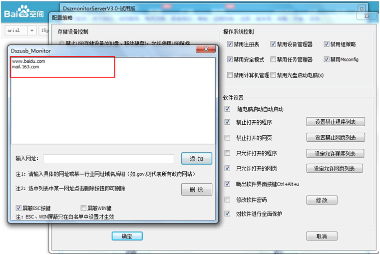 配置策略是:只允许打开的网页www.baidu.com和mail.163.com两个网址,设置好后关闭对话框。