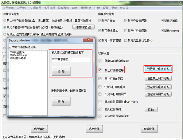 由于第二个功能没有东西试验,那么就试一下禁止打开的程序也是关于网络共享的,如对于wifi共享精灵、wifi万能钥匙等无线wifi共享软件,由于其运行必须依赖于电脑自身的无线网卡,因此可以通过“大势至禁用USB软件”禁用电脑无线网卡的方式来屏蔽wifi共享精灵软件的使用;当然,如果你还需要用无线网卡,那么就不能禁用无线网卡的方式来禁用wifi万能钥匙了,这个时候我们可以通过大势至USB端口管理软件的“禁止打开的程序”这里,可以添加禁止安装或运行的软件,这样我们可以将“wifi共享精灵”等软件,添加到“禁止打开的程序”列表,这样用户就无法安装wifi共享精灵软件,自然也就无法通过wifi共享精灵软件来上网了。如下图所示: