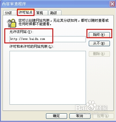 4、这时就添加到“许可网站列表”,也就是没在这表里的需要访问时都要输入密码。