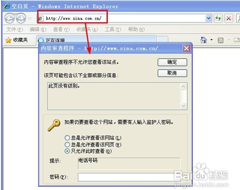 5、然后我们来看看效果,输入新浪网,回车,这时就提示要密码才能访问了。