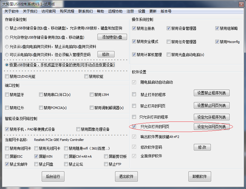大势至USB监控系统其实是一款专业的控制电脑USB接口、限制电脑使用U盘等移动存储设备的软件,企业可以通过这个软件禁止从电脑向外拷贝资料,保护企业信息的安全。我们可以利用一下此系统自带的网址白名单功能,具体操作步骤如下: