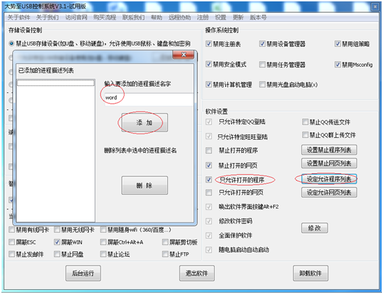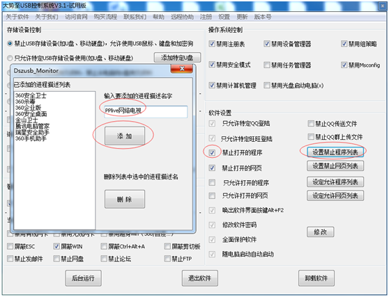 鉴于单纯的网络管理制度无法有效约束和规范员工上网行为,因此采取一定的电脑安全管理软件、计算机控制软件来限制员工上网就成为企业网络管理的必然选择。针对企业局域网员工电脑随意安装软件的行为,可以通过一套“大势至电脑U口控制软件”(下载地址:http://www.grablan.com/monitorusb.html),虽然这是一款专门禁用计算机U口、禁止USB存储设备使用的软件,但是集成了禁止电脑安装软件、禁止自动安装软件、禁止后台偷偷安装软件的行为,同时操作也极为简单,用户只需要添加禁止安装的软件名称或只允许安装和运行的软件名称就可以实现。这里需要说明一下,如果你想明确禁止安装某些软件,则你可以启用“禁止运行的软件”这个功能,并点击后面的“设置禁止程序列表”,添加禁止安装或运行的程序名称就可以了,如下图所示: