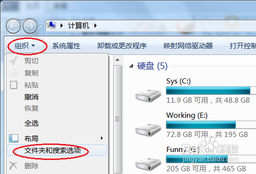 在操作系统的安装目录下面,一般为C:\Windows,点击左上角的“组织”,再选择“文件夹和搜索选项”: