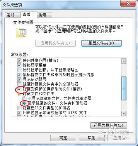 在打开的“文件夹选项”中选择“查看”标签,然后在高级设置--隐藏文件和文件夹中选择“显示隐藏的文件和文件夹”,点击确定即可。