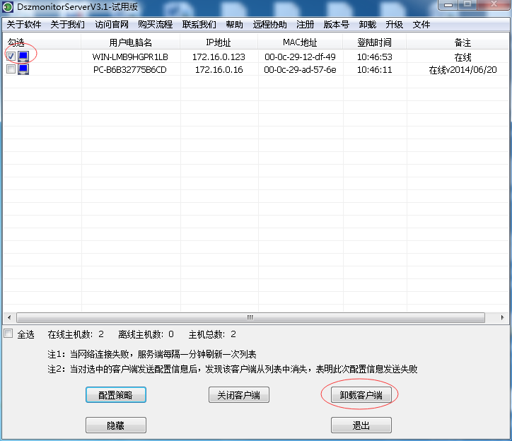 6、网络版卸载方法。客户端的卸载可以通过管理端卸载客户端,打勾选中某个或全部客户端,然后点击软件界面上的“卸载客户端”即可卸载相应客户端;管理端的卸载可以直接到安装目录(默认安装路径为C:\Windows\DszusbmonitorServer,新版本V3.1以后,默认安装路径为D:\Program Files\Dszusbmonitor)下面删除即可,如下图所示: