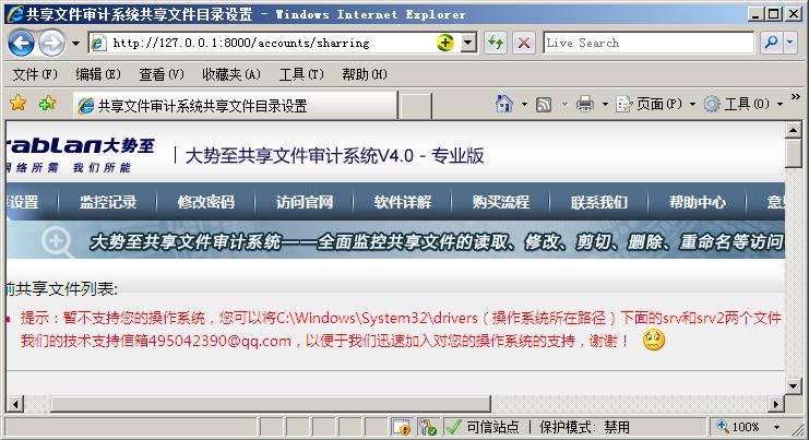 6、IE配置的问题,通常情况下是启用了服务器IE的增强性配置。这个时候启动大势至共享文件审计系统之后,打开登录页面无法登录或者登陆进去之后不显示本机的共享文件,也不显示启动监控按钮,如下图所示: