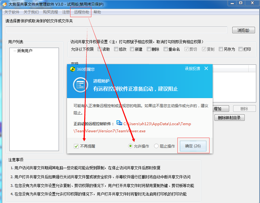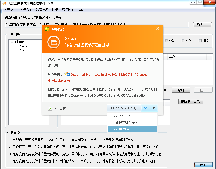 同时,在您对共享文件进行加密的过程中,如果有杀毒软件拦截或警示,则一定要选择“允许程序所有操作”,这样才可以加密保护成功,如下图所示: