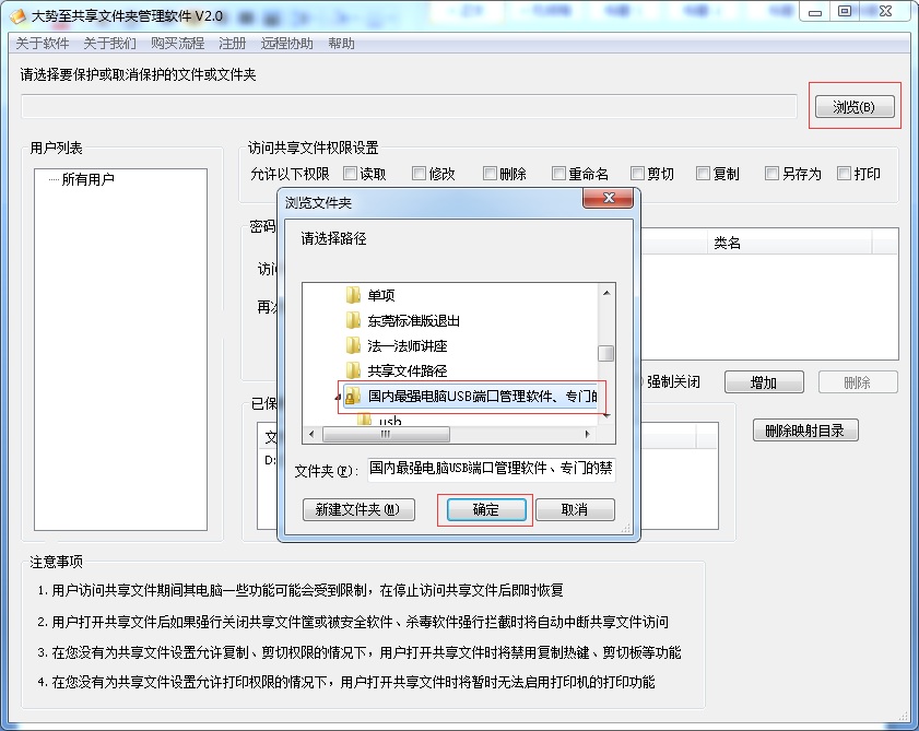 然后,我们在“大势至共享文件夹管理软件”中点击“浏览”,然后找到我们想要加密的共享文件夹,选中,然后点击“确定”,如下图所示: