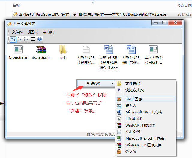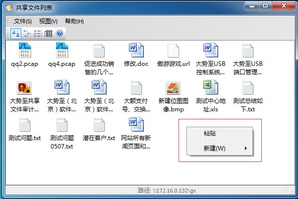 图:大势至共享文件夹加密软件V2.1版本新增了“新建”功能,可以允许客户端创建共享文件复制或拖拽到共享文件列表中去