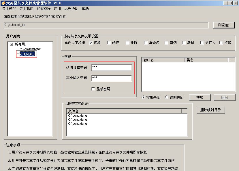点击“确定”之后,共享文件夹就被添加到软件界面上要保护的文件或文件夹路径了,然后同时在左侧的“用户列表”这里也就出现当前电脑或服务器上所有的用户账户,这里你可以根据自己的需要鼠标点击某个账户(或者不点击,则默认是所有用户),然后在右侧的“访问共享文件权限设置”,你就可以勾选想要赋予用户访问共享文件的各种权限了。