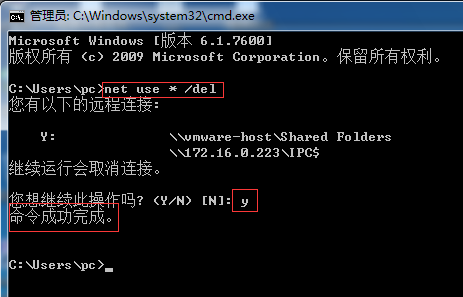 注意:由于Windows操作系统共享功能较弱,同时不同操作系统访问共享时经常会提示无法访问的情况,这种情况下可以通过命令(开始-运行-CMD,回车,然后输入net use * /del,然后会提示是否取消连接,输入)来优化和修复共享访问不成功的问题。如下图所示: