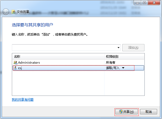 加密保护共享文件后,我们还需要重新将其设置为共享才可以从其他电脑访问(注意:一定是将此共享文件夹整个设置为共享),如下图所示: